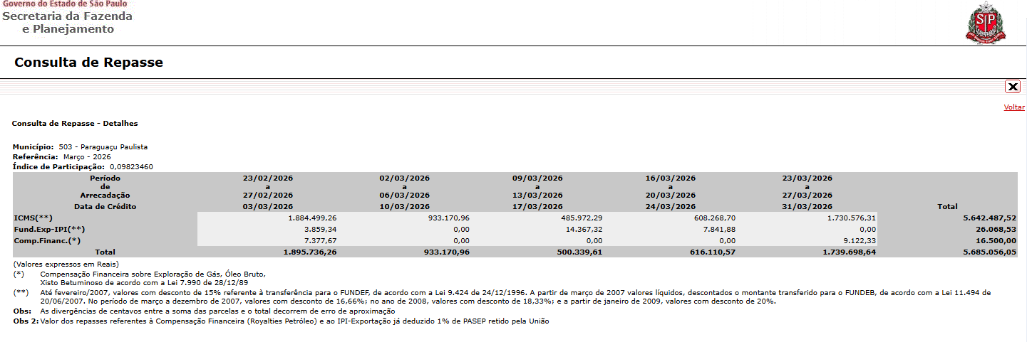 O Governo do Estado de São Paulo, por meio da Secretaria da Fazenda e Planejamento (Sefaz-SP), realiza nesta terça-feira, 31 de março de 2026, o quinto e último depósito referente à cota-parte do Imposto sobre Circulação de Mercadorias e Serviços (ICMS) do mês. Paraguaçu Paulista figura no seleto grupo de municípios da região que asseguraram repasses milionários nesta etapa final de transferências estaduais.